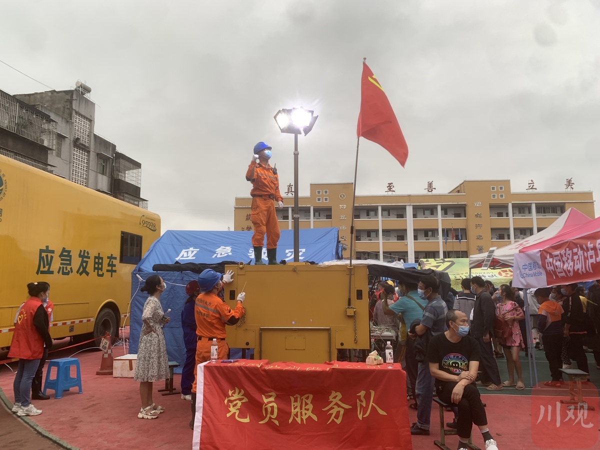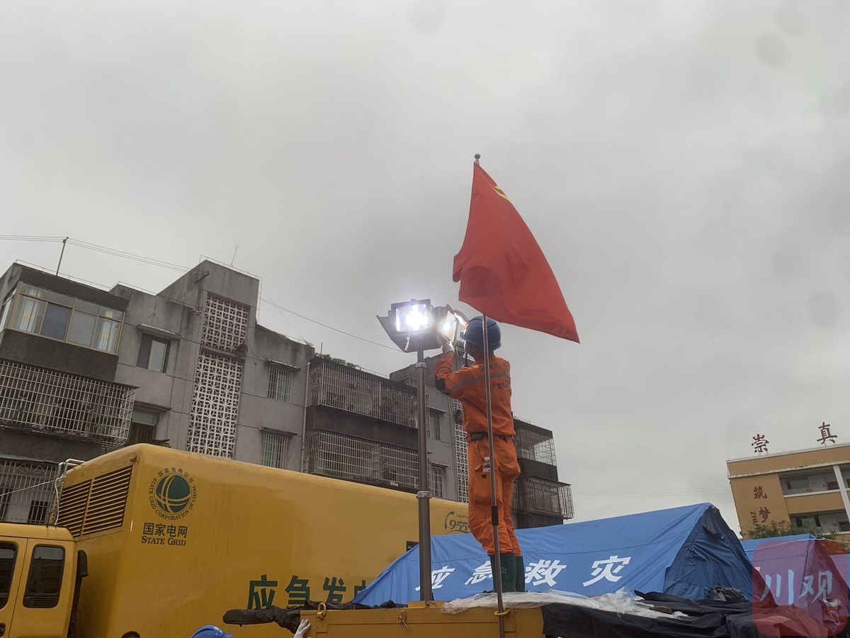 “亮啰,亮啰。有灯了,晚上不用摸黑了!”9月16日下午6点,天色渐暗,泸州市泸县福集镇泸县龙脑桥中心小学临时安置点亮起第一盏灯。