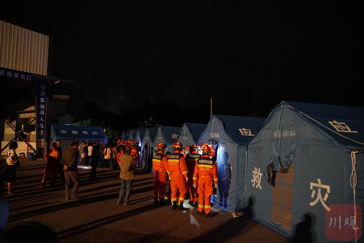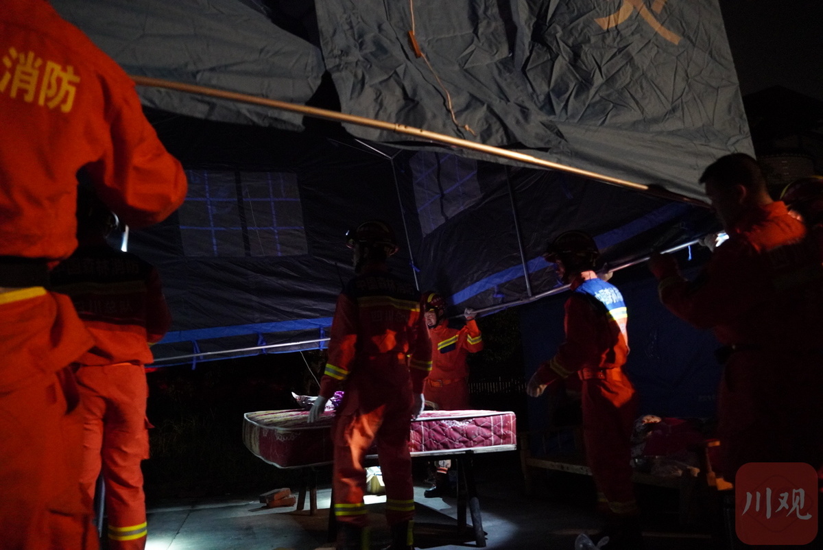 9月16日21时,四川森林消防总队甘孜支队50名指战员在地震灾区泸县福集镇龙华村为地方受灾群众搭建帐篷,搬运相应物资,并沿途用无人机喊话劝导灾区部分回家居住村民,让其返回安置点。