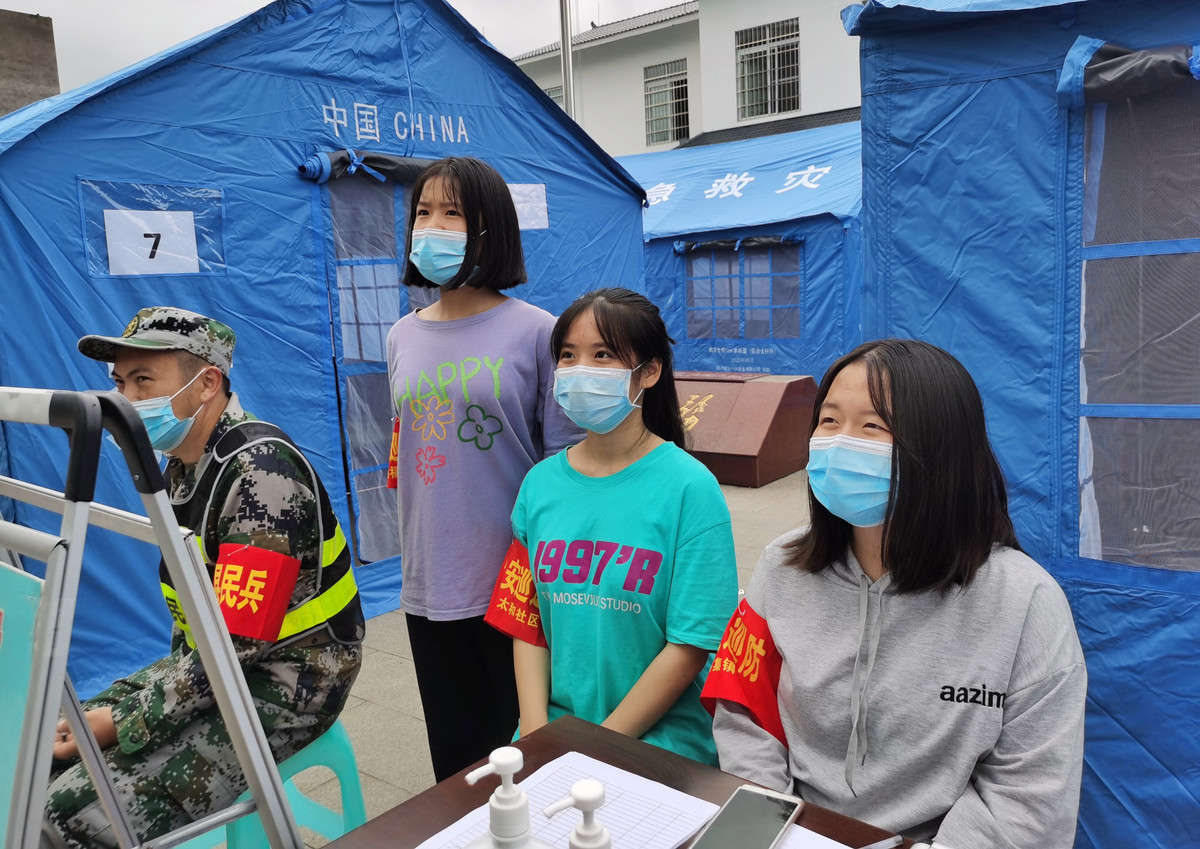 另一边,还有几位别着“泸县新时代文明实践志愿者”红色袖章的学生志愿者,有的在帮着卷帐篷外的门帘,有的在收拾被子、扫地等,分工明确。