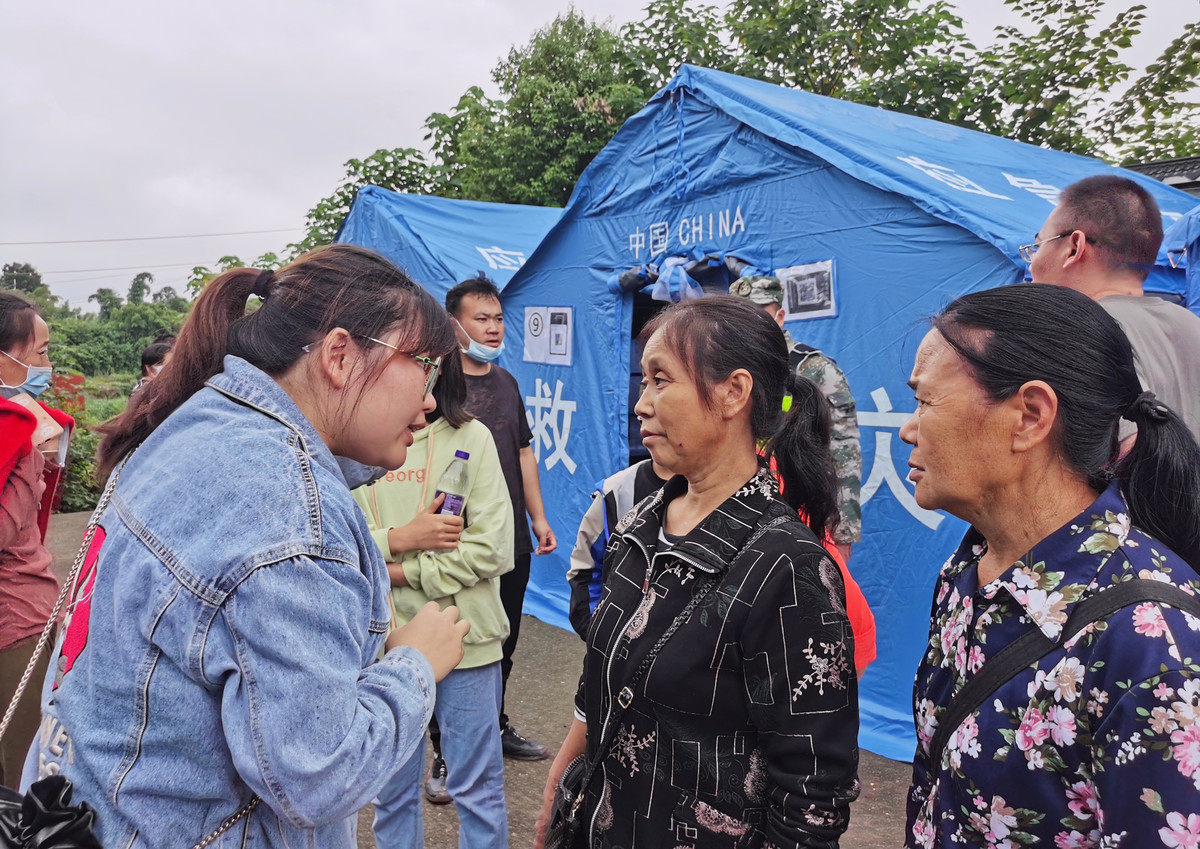 曾世慧正在草坝村小学临时安置点和村民们沟通。郭荞璐 摄