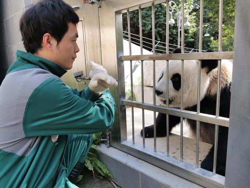 成都熊猫基地“奶爸”张力行正在对“心心”进行行为训练(澳门石排湾郊野公园供图)