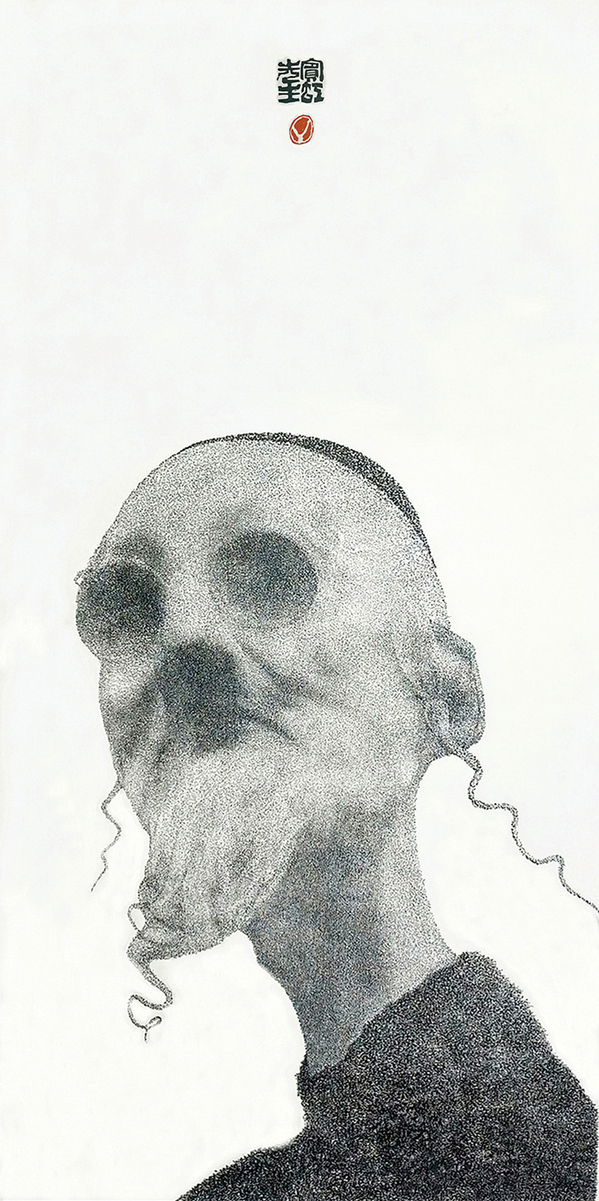 在展厅另一侧,大幅黑白版画《宾虹先生》让人多少有些意外。版画一改传统黑白墨色,选用蓝灰色,呈现人物特性。马蜻和王子奇夫妻联手,共同完成了这幅作品。他们都是大画家黄宾虹的“粉丝”,为了表达对老先生的敬意,他们把黄宾虹人物形象作为版画创造主题,并选用更能传递抒情情感的蓝灰调。