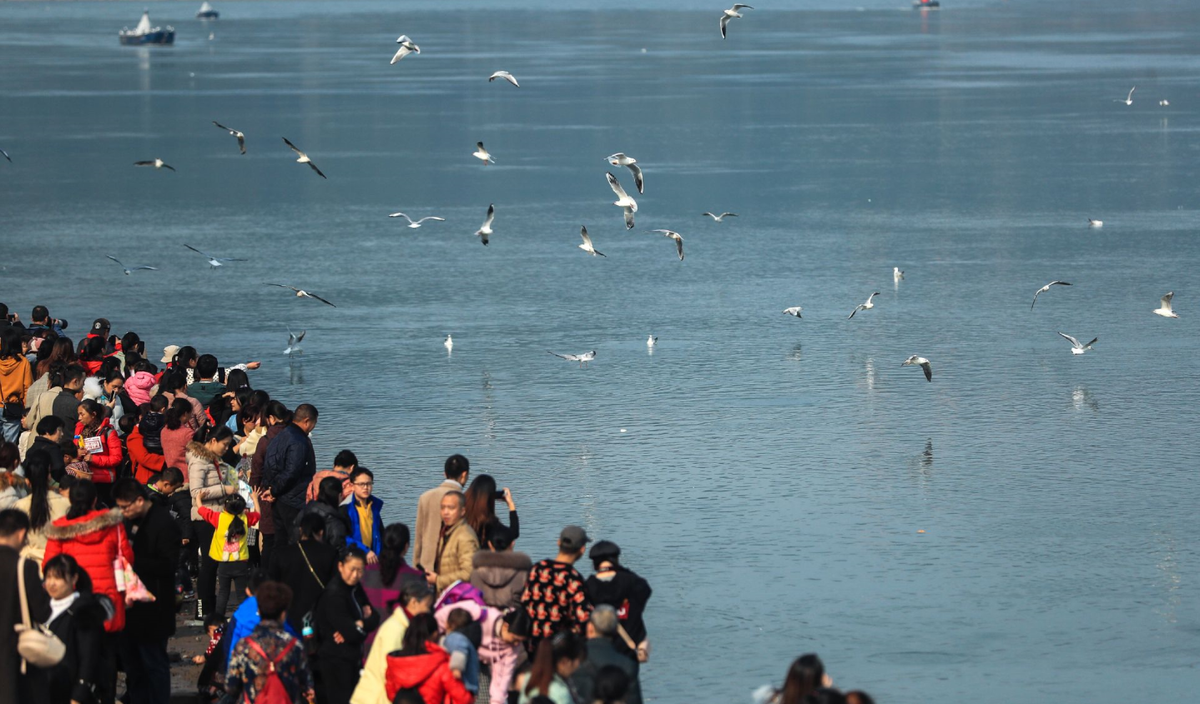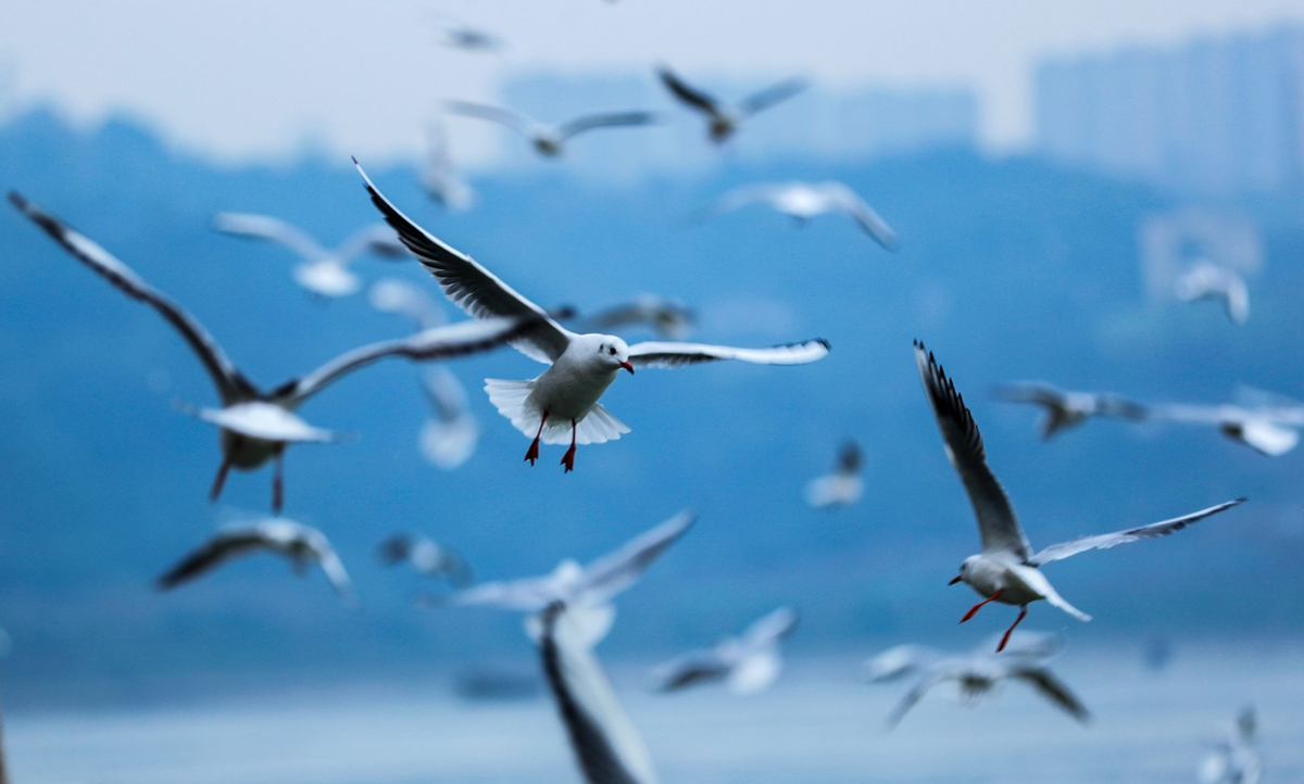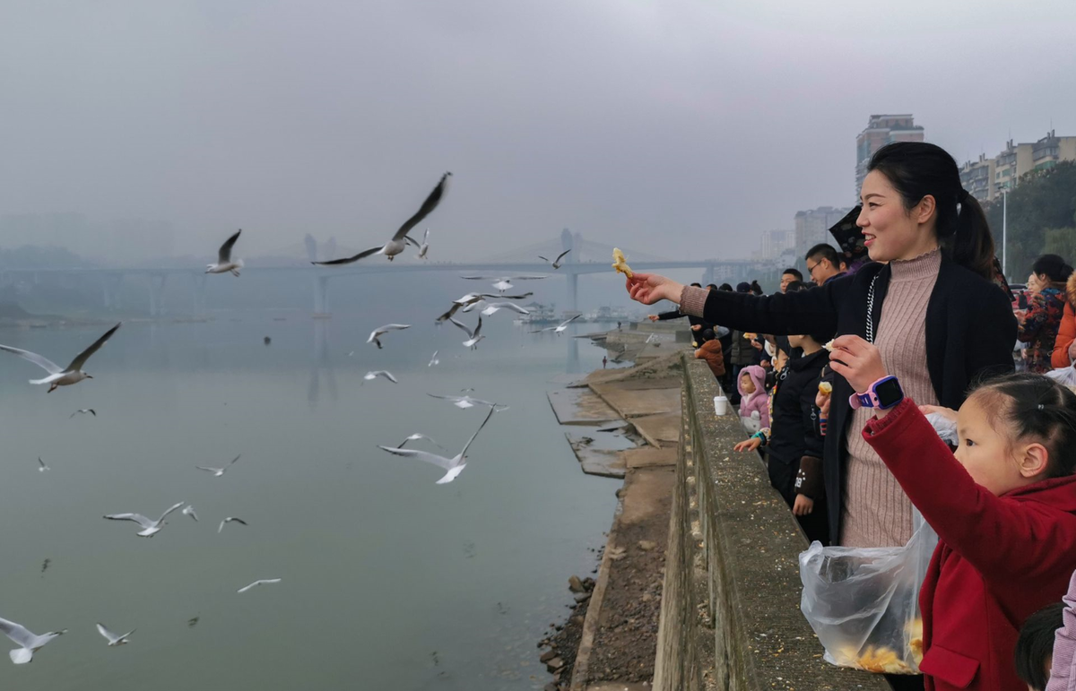 泸州江阳区东门口,红嘴鸥在嬉戏逐食,引来众多市民喂食(刘学懿摄)