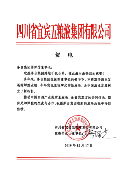 五粮液集团党委书记、董事长李曙光在获悉这一消息后,第一时间以本人和五粮液集团的名义向茅台集团和李保芳发去贺电。贺电中写到:“欣悉茅台集团跨越千亿台阶,谨此表示最热烈祝贺!多年来,茅台集团在保芳董事长的领导下,不断取得酒业发展的辉煌业绩,今年实现里程碑式的新发展,为中国酒业发展树立了新标杆。”
