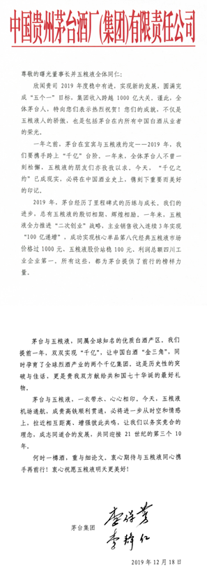 12月18日,在五粮液第二十三届1218共商共建共享大会上,李曙光也正式宣称:今年五粮液集团实现了稳中有进的新发展,销售收入跨越千亿台阶已成定局。随后,茅台集团也向五粮液集团和李曙光发出贺电:“我们提前一年,双双实现‘千亿’,让中国白酒金三角同时孕育了全球烈酒产业的两个千亿集团,这是历史性的突破和佳话。”