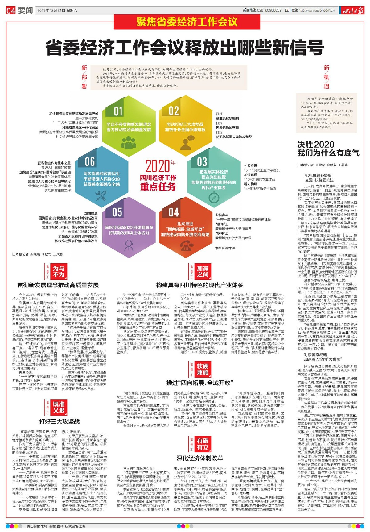 12月20日,省委经济工作会议在成都举行,对明年全省经济工作作出全面安排。2019年,四川面对多重矛盾叠加、多种困难交织的复杂局面,坚持稳中求进工作总基调,全省经济社会发展取得显著成效。即将到来的2020年,四川又将怎样破解难题、狠抓落实、推动工作,激发各方面抓经济发展的创造力和主动性?