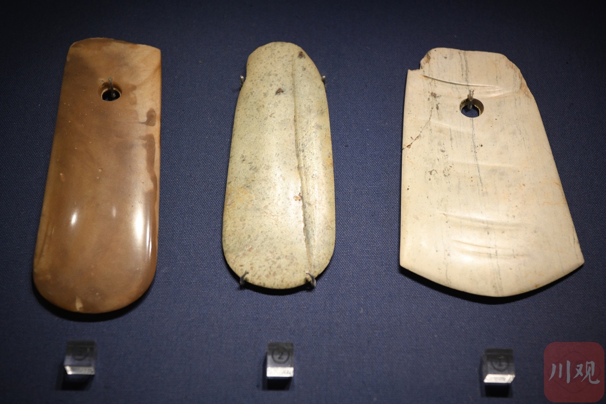 从左至右依次为玛瑙钺、玉斧、玉钺