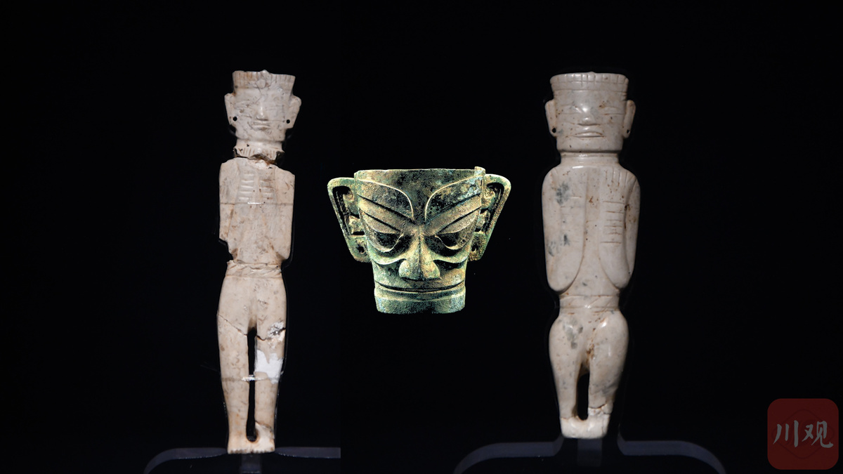 凌家滩出土的站立玉人(左)、坐立玉人(右)与三星堆出土的青铜面具(中)对比
