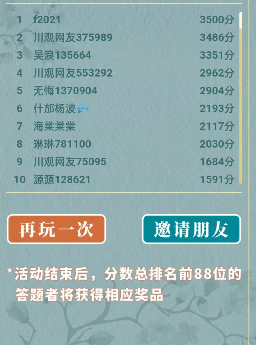 前三轮比赛,答对三题即可参与抽奖,1000份川观文创在等你。如果抽不到奖,咱们不凭手气靠实力也是可以的,丰富的题库只要你不停下来,每一轮的分数都会计入总数,前88名都有丰厚大奖。所谓天道酬勤,非常适用于这场挑战赛。