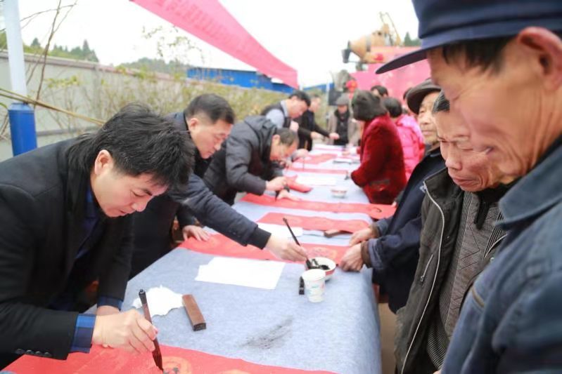 在舞台旁,来自广安市书法家协会、广安市美术家协会、广安市摄影家协会的近20名文艺志愿者开展了送书画、送春联、拍摄全家福等系列活动,提前为乡亲们送上节日祝福。广安市美术家协会的画家王明洲在现场描绘了一幅《美丽的新农村》山水画。远处巍峨的山峰下,坐落着美丽的新农村,白墙黑瓦,四周环绕着飘香的果树,村口还有一群带着丰收的喜悦的村民。