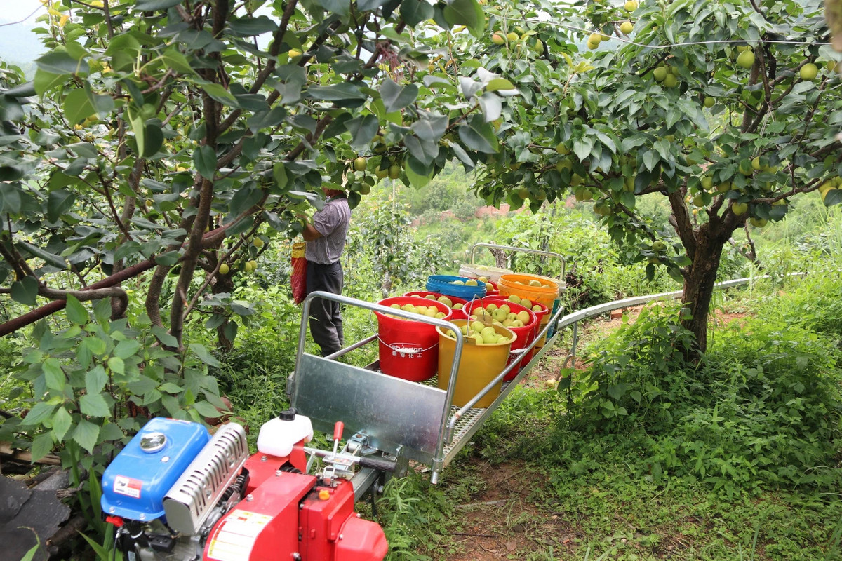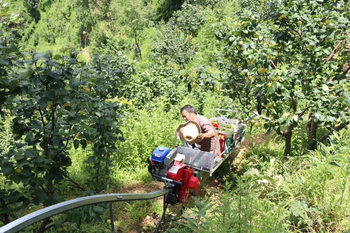 由于村里山地较多,除了种植千亩原生态绿色蔬菜,还在山坡上种起梨、柿子等果树。对于梨子种得多,家里又缺少劳动力的果农来说,采摘是一大难题。“以前,需要一背一背的将梨子背回来,爬坡上坎很辛苦,男娃儿都吃不消。”刀聪笑说。