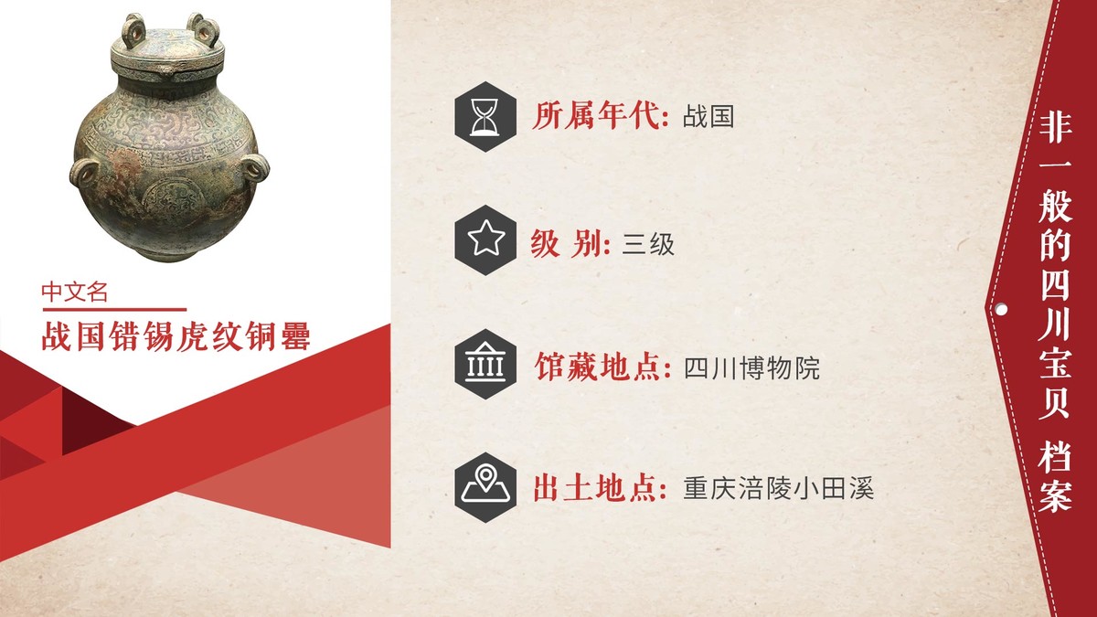 这件错锡虎纹铜罍,经文物医生修复以后,恢复庄重大气的模样,尤其是器身上绵延的虎纹,体现了古代巴人对虎的崇拜。