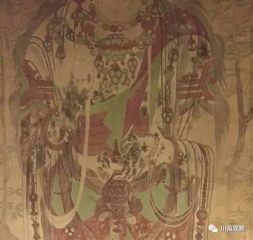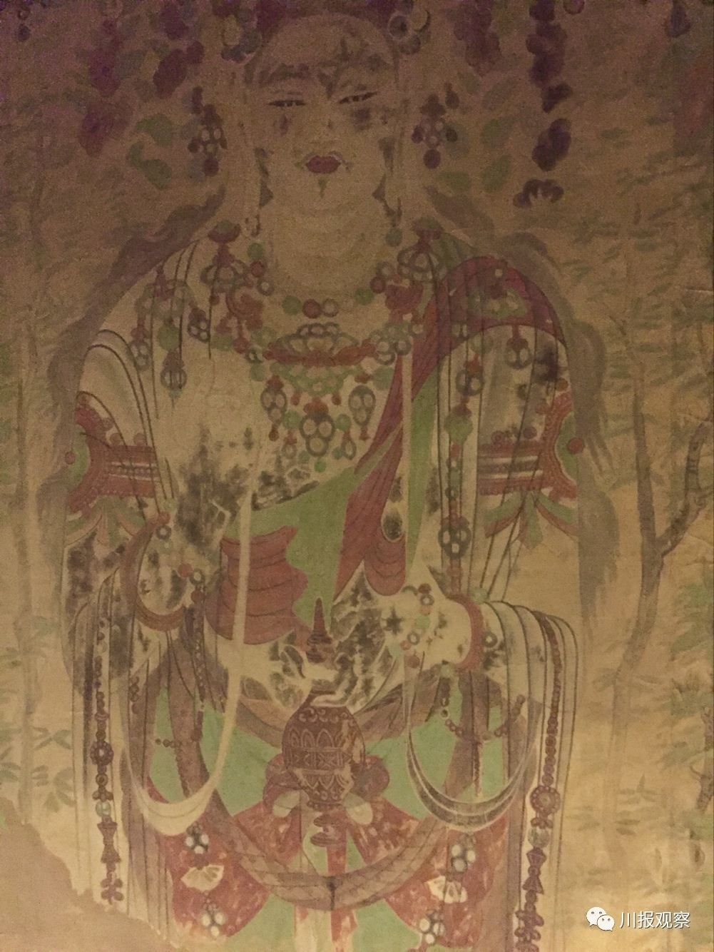 仔细看观世音,但见他头顶华盖,头戴“化佛冠,就是帽子正中间有尊小佛像那种,身披飘带,穿着绿裙子,绿色是敦煌石窟中“招牌”颜色,历经千年不变,很多其他色种已经变色或直接消失了。左手持净瓶,右手拈柳枝,丹凤眼,柳叶眉,神态安详,不怒自威,总之就是只是因为在人群中看了他一眼,就忍不住要跪了……