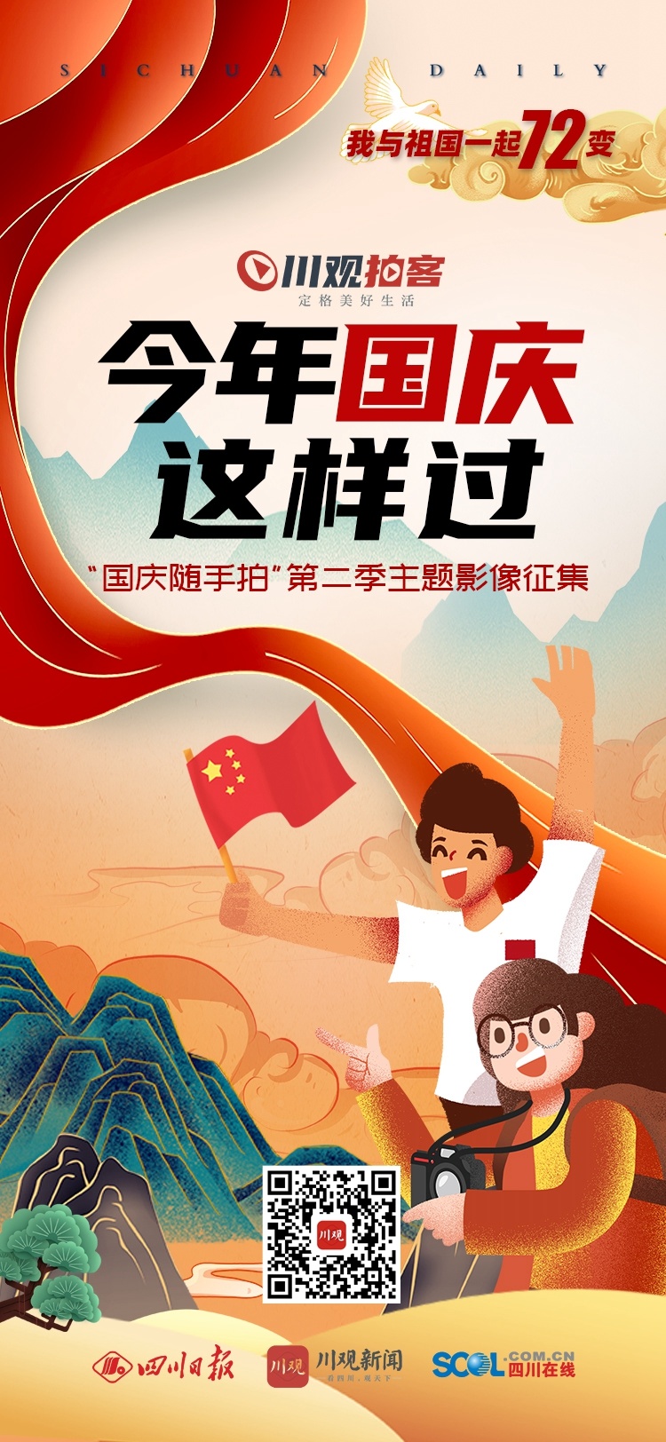 即日起,川观拍客“国庆随手拍”第二季主题影像征集正式启动,10月1日—8日,我们将在川观新闻拍客频道推出《我与祖国一起“72变”——今年国庆这样过》专题,集中展示“我给祖国送祝福”、“国庆‘驴’行日记”、“我光荣,我在一线值班”三大主题,优秀稿件除专题展示外还将在官方微博择机发布,优秀图片作品将有机会登上《四川日报》视觉专版。