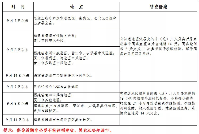 1、从这些地区来(返)蓉需主动报备。近期厦门、泉州、哈尔滨等多地出现本土病例,全国中高风险地区增加,市民朋友切不可放松警惕,特别提醒从这些地区来(返)蓉人员主动配合疫情防控工作,具体管控措施详见下表(表格来源:四川疾控)——