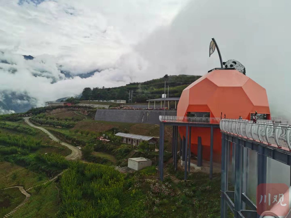 “爬墙大熊猫”观景台位于布瓦村高半山,海拔2000多米。这里统称揽城观景平台,由玻璃栈道、甜樱桃、熊猫、粉黛乱子草等元素构成,可以眺望汶川县城全景。