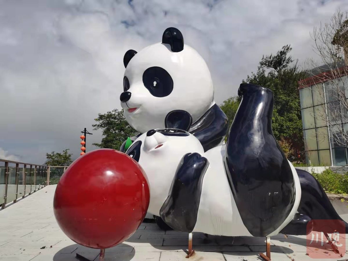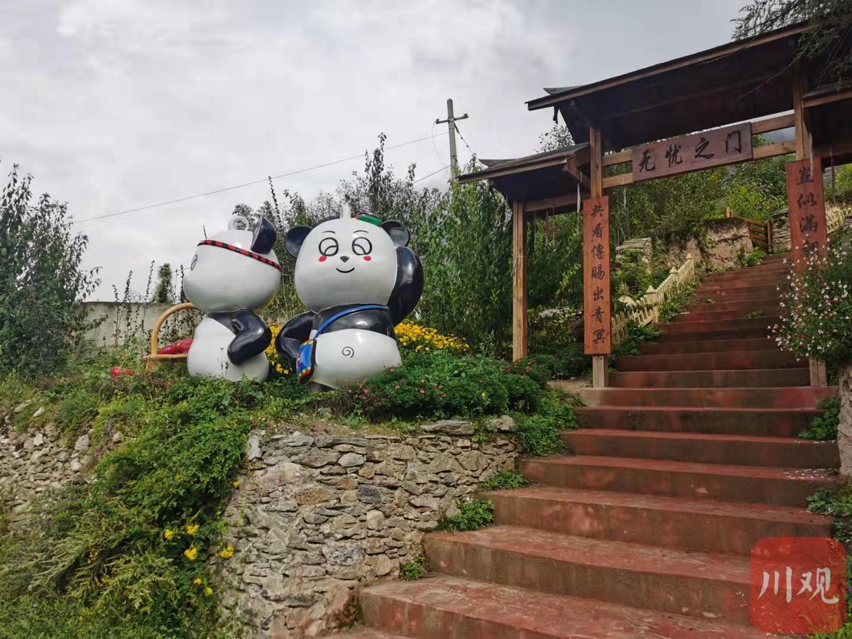 在汶川县布瓦村“花果山”观景台,一只可爱的“爬墙大熊猫”俯在甜樱桃的雕像之上,眺望远山。