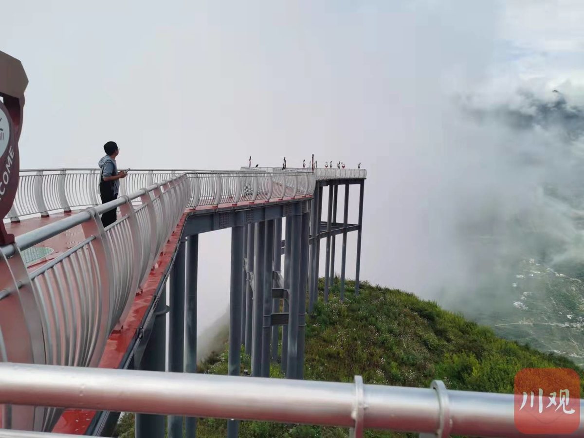 栈道长约130米,高约19米,走在栈道上,绕过直径20余米的甜樱桃的雕像,迎风而立,远远望去,云的下面是县城,云的上面是山,背后是可爱的“大熊猫”,在甜樱桃雕像上时隐时现。