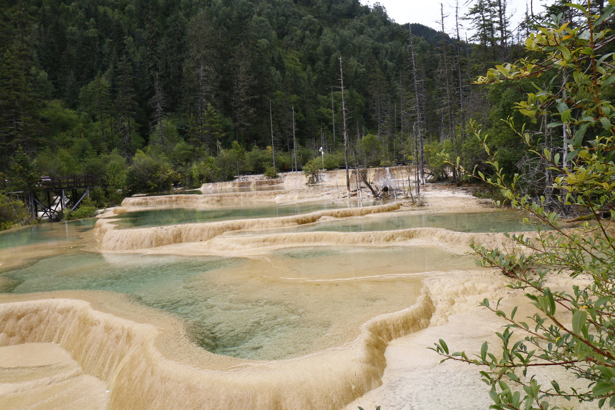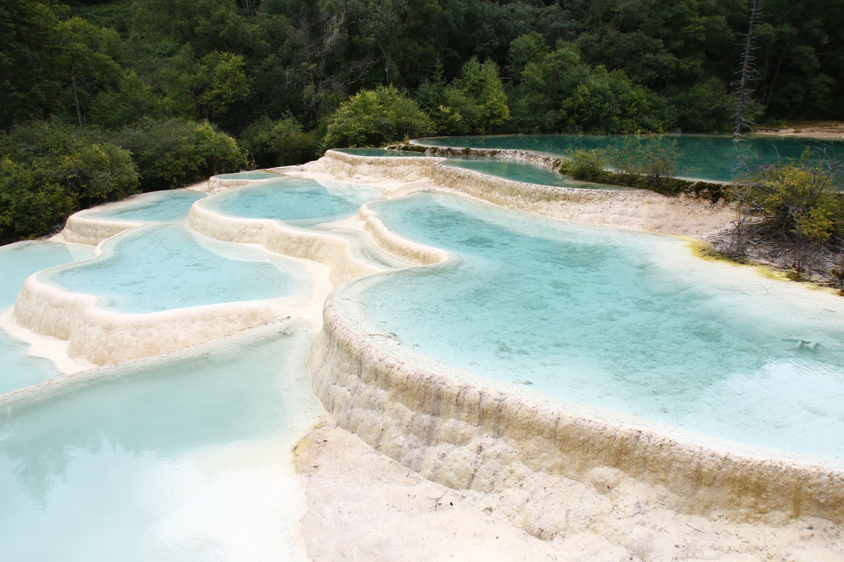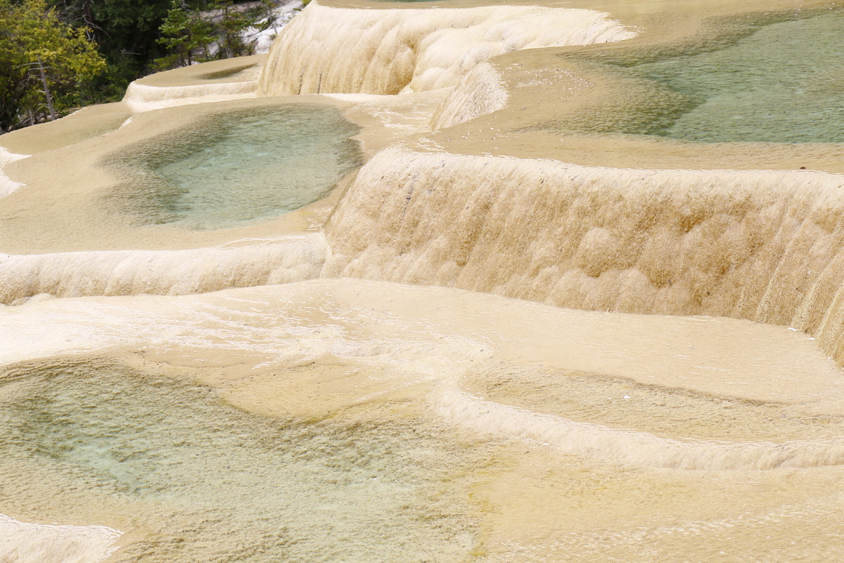 神仙池的地貌侵蚀切割得特别剧烈,溪间的落差大,山地形成了2600个大小不等、水色明丽的水潭和高山湖泊,也就是当地人说的“海子”和“钙华台地”。它是典型的地表喀斯特地貌,成片的山坡被黄色、乳白色钙质包裹,形成一个个奇特的盆筑状钙华池和钙华坡。