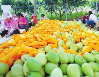 在全国首条芒果灭菌智能分选线上,20多名员工在各环节上有序作业。据钟方祥介绍,分选线日加工能力达25万公斤,通过灭菌能够延长果蔬供货期,提高品质,由此提高单价10%以上,也带动当地85%以上的芒果经初加工后外销。