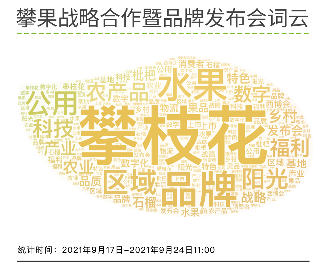 随着宣传报道持续深入,“攀果”作为搜索关键词的热度在网络上不断飙升,攀枝花特色水果的形象深入人心。据统计,发布会举办后一周,“攀果”战略合作暨品牌发布会词云共出现了20余个高频词,覆盖了城市、产业 、农业、地域、资源、福利等多个层面,让阳光“攀果”全方位、立体化地呈现在公众面前。其中,攀枝花达943次,品牌达896次,水果达872次,区域达872次,公用达845次,农产品达804次。