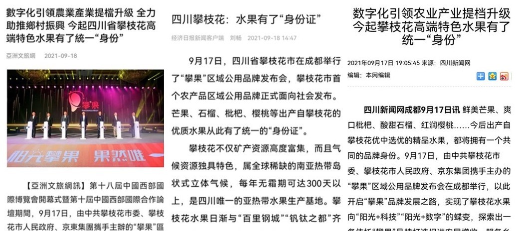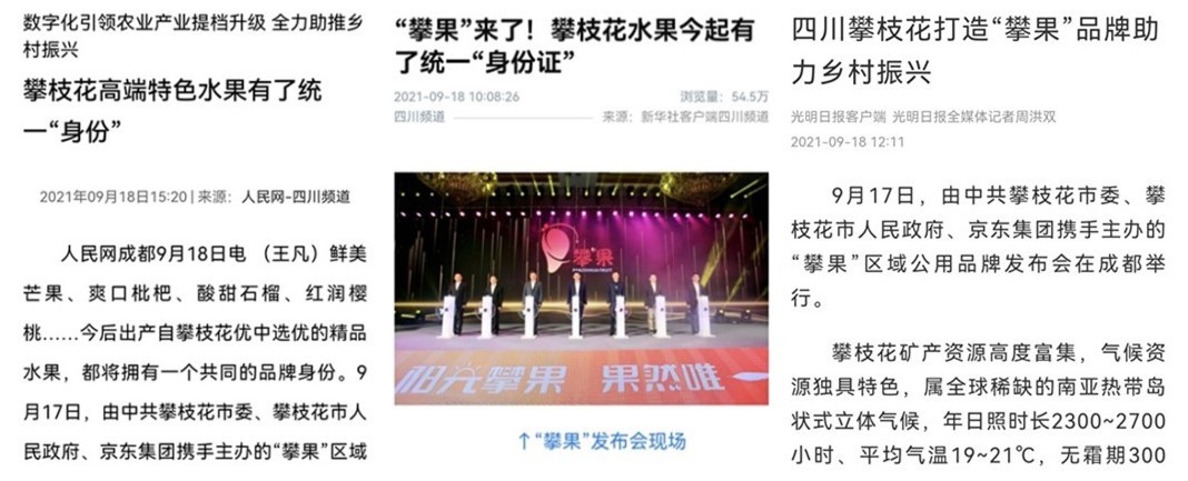 值得一提的是,关注“攀果”区域公用品牌的主流媒体发布原创类新闻稿件后,迅速被各大门户网站、新媒体、自媒体抓取并转发,传播量呈几何倍数增加。不少媒体把“数字化引领”“身份标识”“高端特色水果”等“攀果”特征放在标题里,持续引发关注。