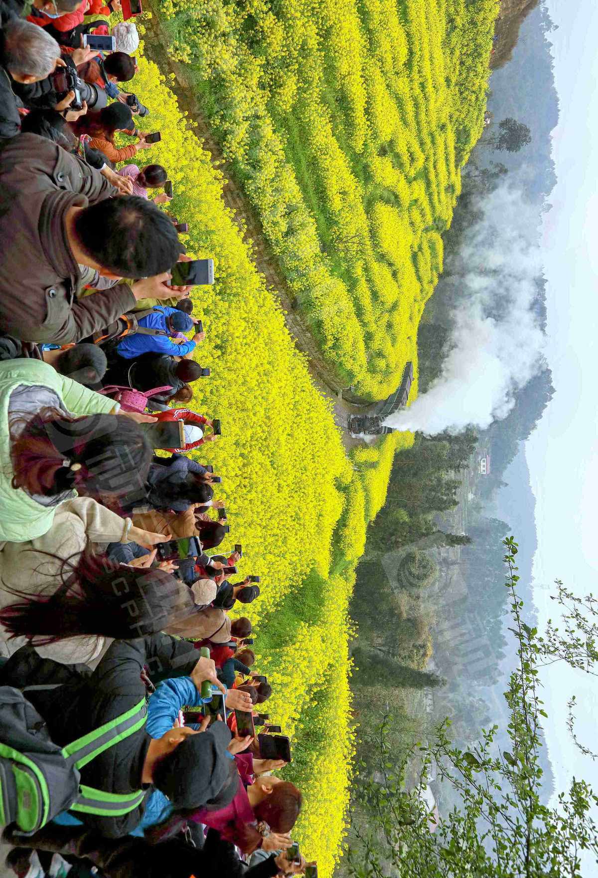 ▲3月20日,一片油菜花海中,一列满载游客的嘉阳小火车旅游专列从中穿行,这是开往春天的小火车。川报观察记者 何海洋 摄