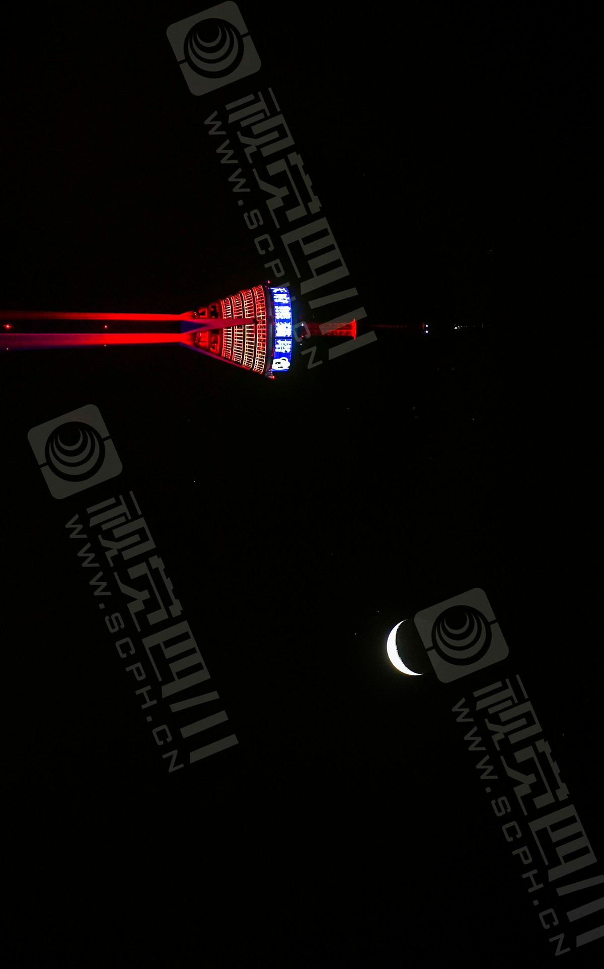 ▲4月9日晚,一轮娥眉月高挂成都上空,清晰可见,扮美夜蓉城。(图为双重曝光)川报观察记者 杨树 摄