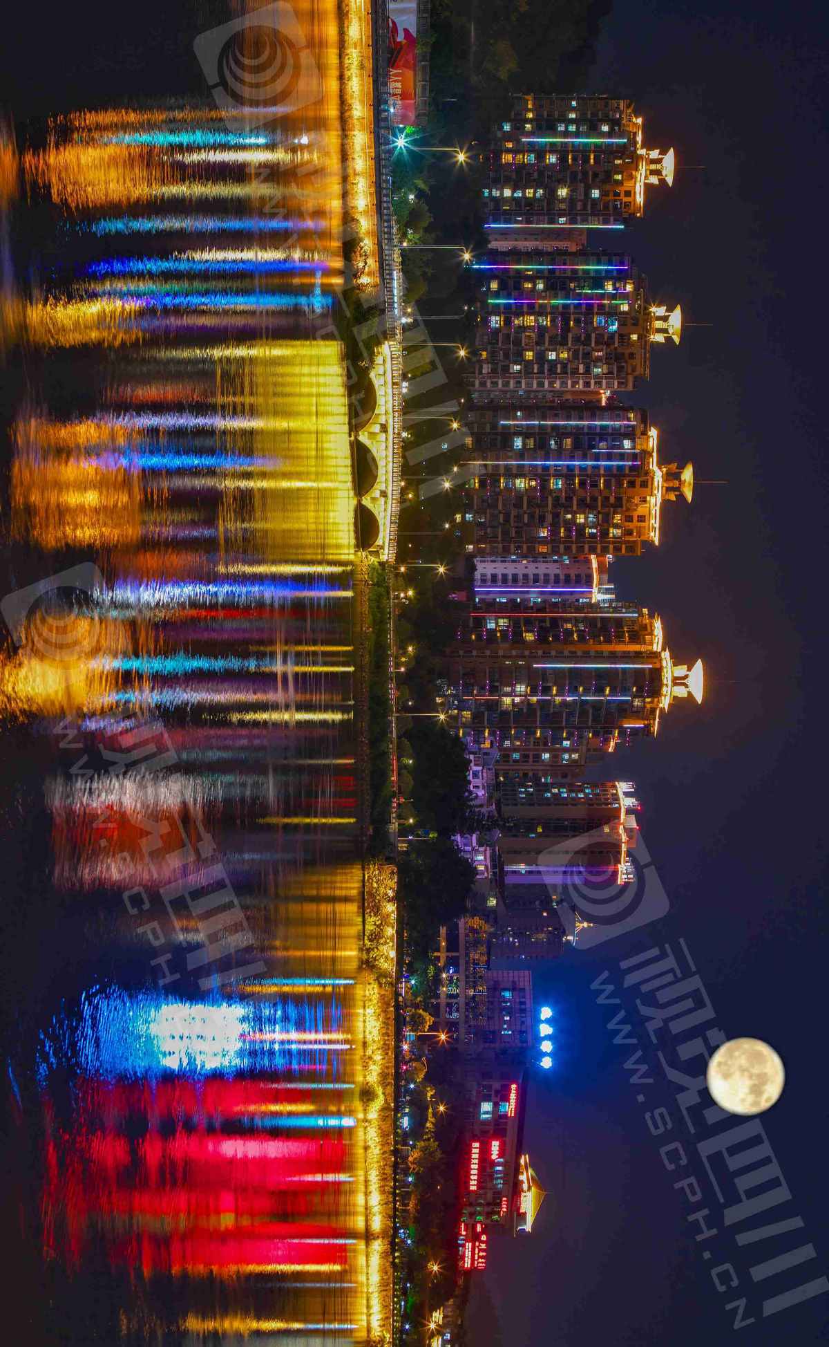 ▲8月15日晚,一轮圆月高悬雅安夜空,和霓虹楼宇遥相辉映,肉眼可见,美不胜收。(图为二次曝光)视觉四川 黄刚 摄