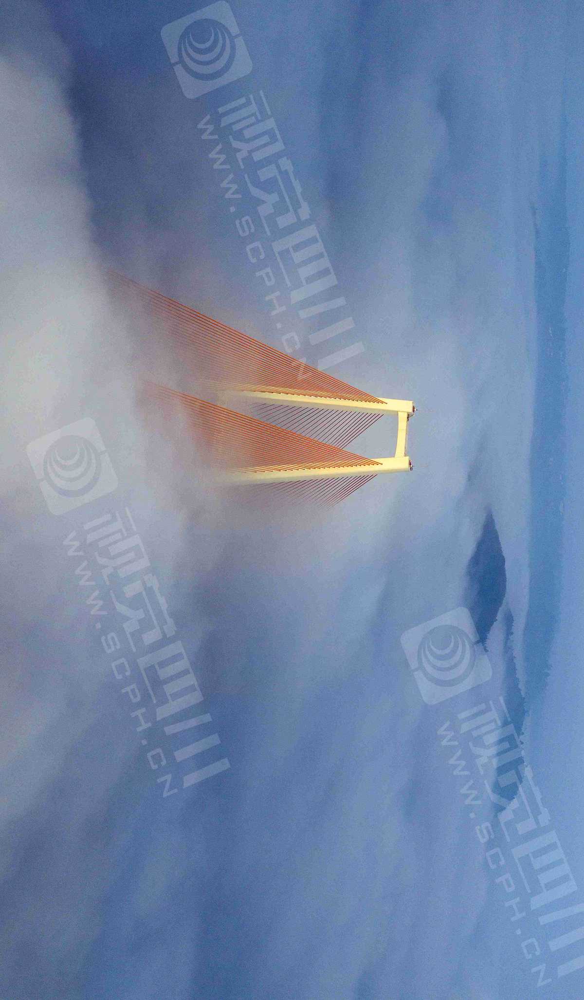 ▲12月7日,四川省广安市大雾笼罩大地,广安市渠江清溪口大桥被大雾环绕,若隐若现,霞光弥漫。151米高的大桥主塔高耸出云层,朝霞照在主塔金色拉索上金光闪闪,美如画卷。视觉四川 周修建 摄