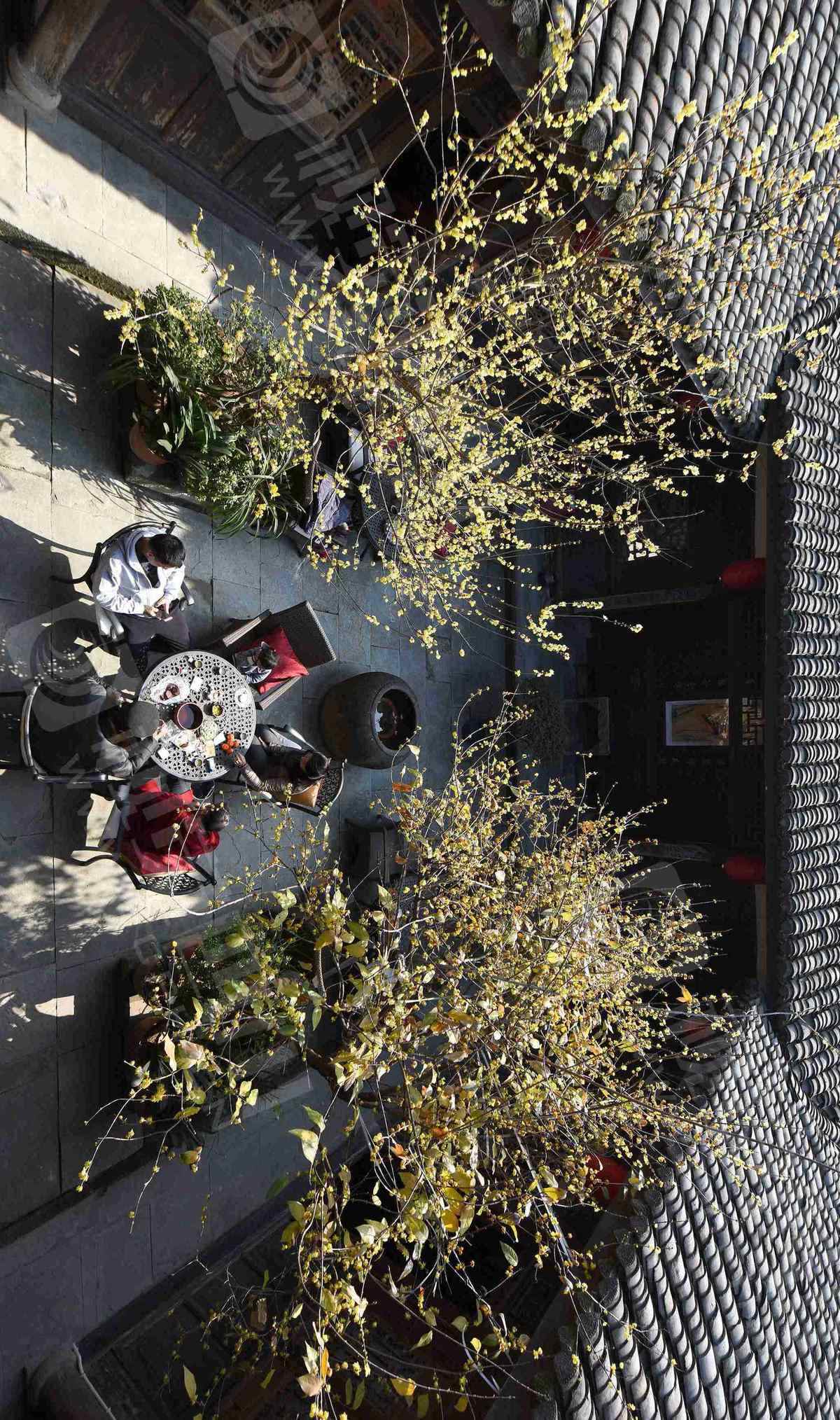 ▲1月22日,冬日暖阳下,阆中古城多个大院里的腊梅香味在阳光里弥散,沁人心脾,赋予了这座有着2300多年历史的古城冬天独特的气质。阆中古城李家大院,来自北京的王先生一家在腊梅树下品茶聊天。视觉四川 王玉贵 摄