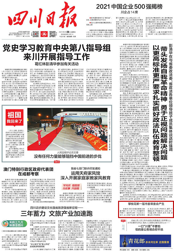 9月25日下午,中共攀枝花市第十一届委员会第一次全体会议举行,会议选举产生新一届市委常委会。张正红当选为市委书记,虞平、林建国当选为市委副书记,江海、姚彬、刘绍玺、张勇、马晓凤、赵平、邓斌、季雷当选为市委常委。