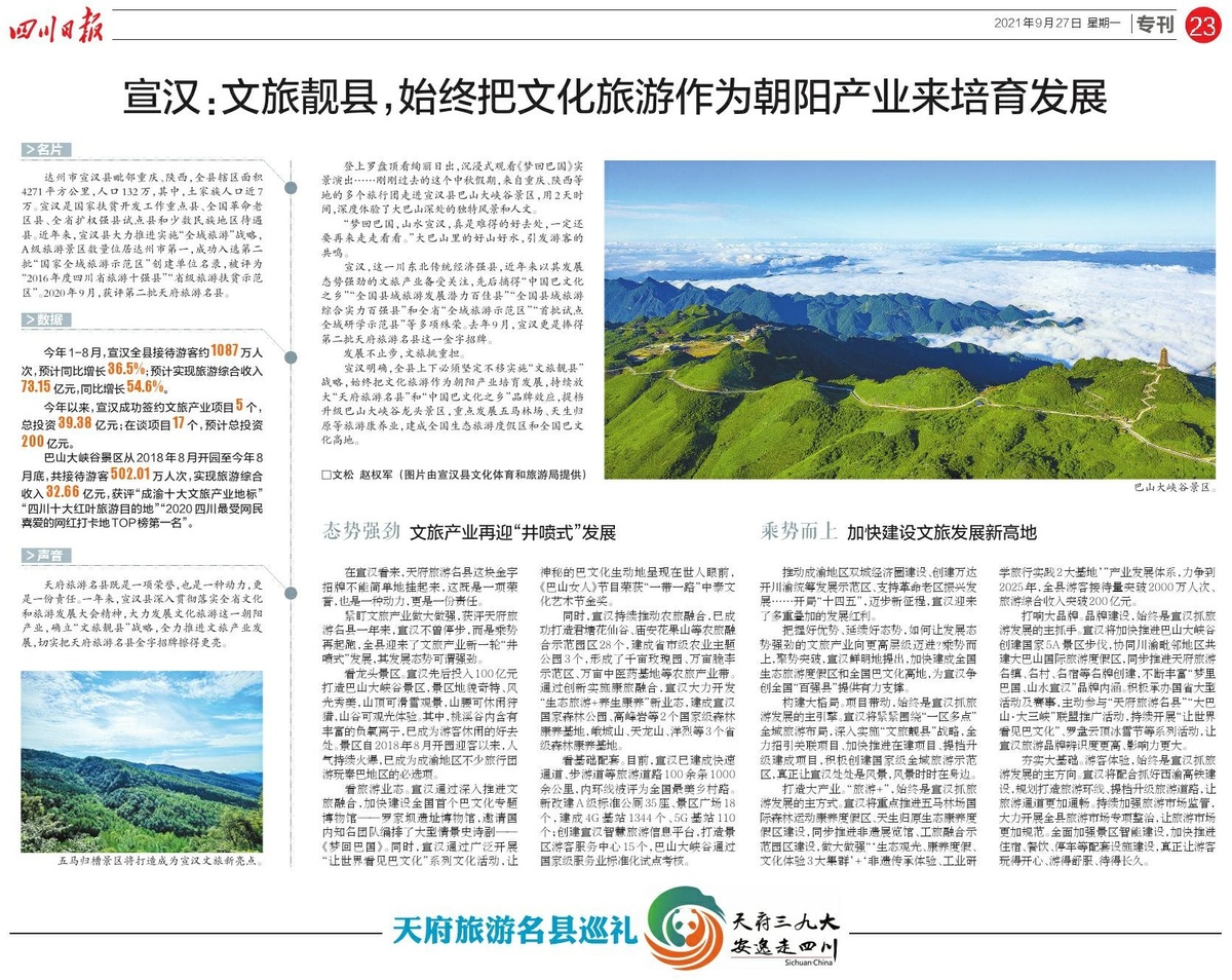 宣汉,这一川东北传统经济强县,近年来以其发展态势强劲的文旅产业备受关注,先后摘得“中国巴文化之乡”“全国县域旅游发展潜力百佳县”“全国县域旅游综合实力百强县”和全省“全域旅游示范区”“首批试点全域研学示范县”等多项殊荣。去年9月,宣汉更是捧得第二批天府旅游名县这一金字招牌。
