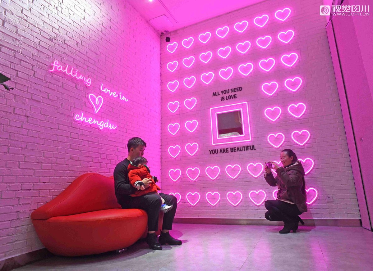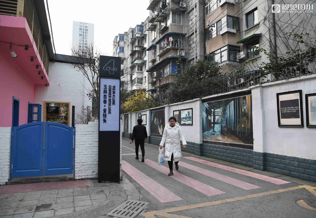 1月7日,成都市武侯区玉林街道玉林四巷“爱转角”主题文创街区内,不少市民在精美的墙绘前拍照留影,十分惬意。