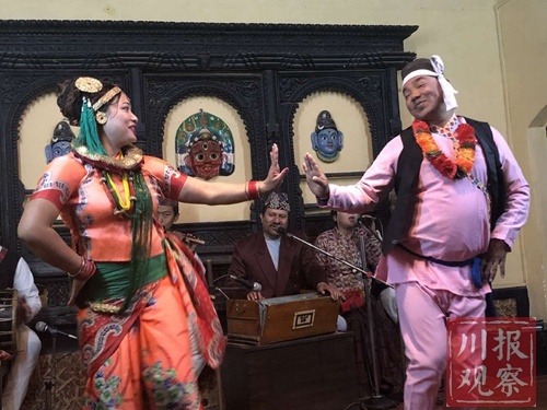 视频中第一段歌舞为Sherpa(夏尔巴)民族的歌舞表演。表演者身着的民族服饰与我国藏族服饰很像,舞蹈的动作、韵律也有相似之处。据当地人介绍,这是因为夏尔巴民族生活的主要区域与我国西藏接壤。