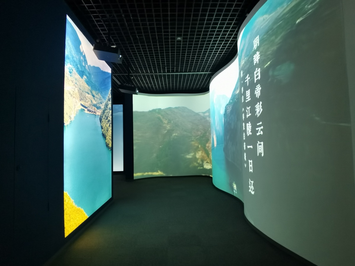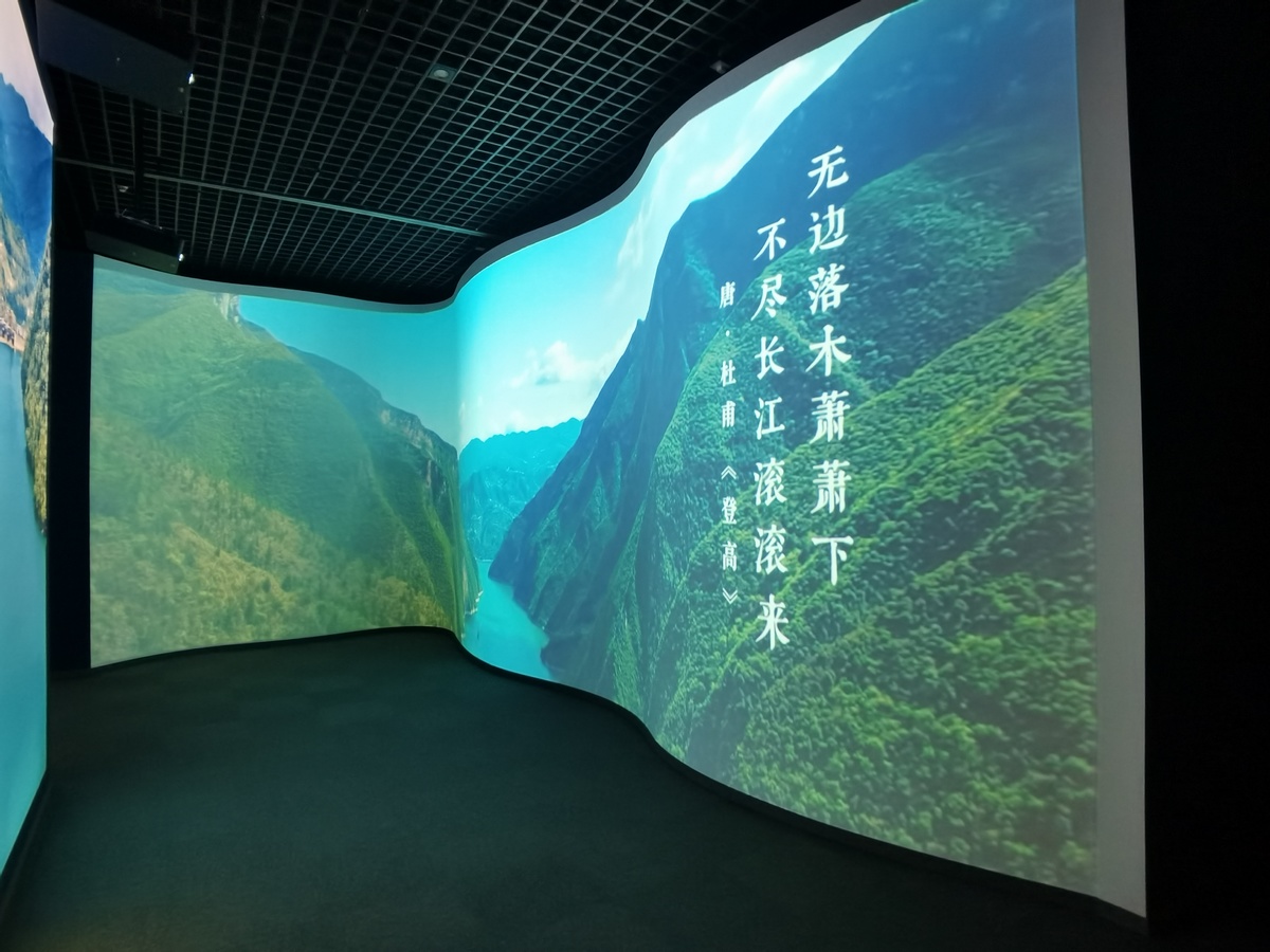 展览序厅、尾厅设计优雅了弧形空间,呼应长江水文特征。序厅专设沉浸式空间,整体施以青铜般蓝绿,顶部用波纹镜配光影设备,营造长江波光粼粼的艺术效果,整体氛围感染力强。