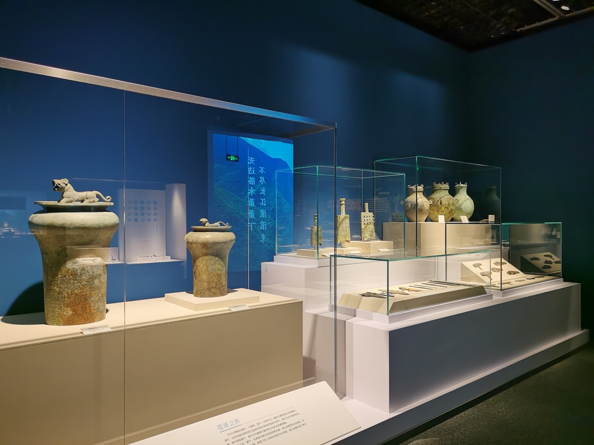 “巴蜀并辉”展区用满天星光,渲染长江上游巴蜀青铜文明的古老与神秘,寓意古蜀文明在历史长空中璀璨夺目。从“巴蜀并辉”经过一段蜿蜒曲折、神似三峡意境的通道,即进入江汉平原“群雄竞华”展区。
