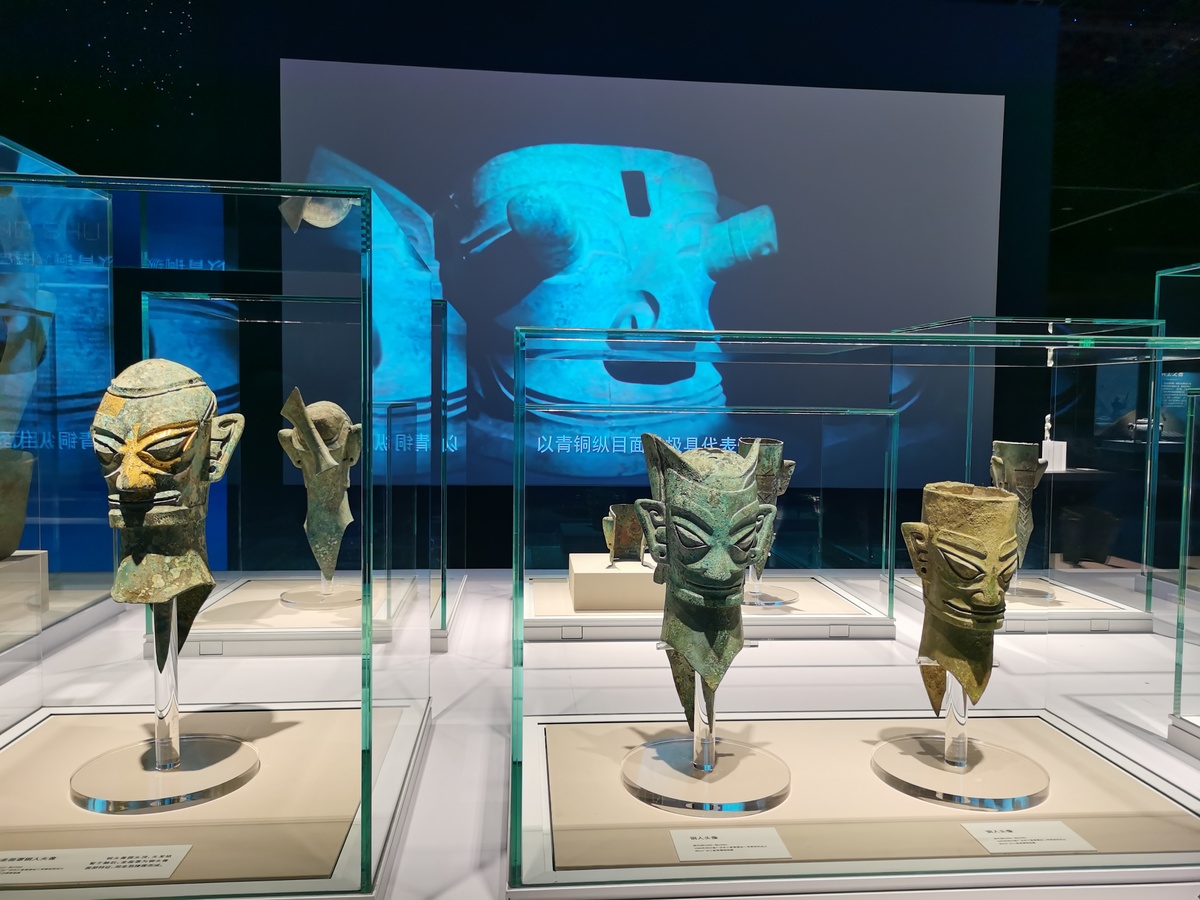 “多元一体”及“尾声”展区的展线迤逦婉转,用朦胧纱幔和依稀灯光表达出水天共一色的语境,描绘出江流入海的壮丽景象,同时象征着异彩纷呈的长江流域青铜文明融入恢宏的中华文明。