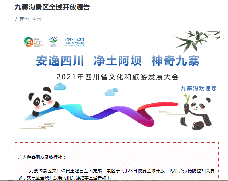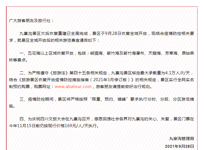 9月28日,九寨沟景区全域恢复开放。九寨沟景区管理局官方微信号当天发布《九寨沟景区全域开放通告》,为庆祝四川文旅大会在九寨沟召开,感恩回馈社会各界对九寨沟的关心、关爱,景区门票在今年11月15日(旺季)前仍按现行价格169元/人/天执行。