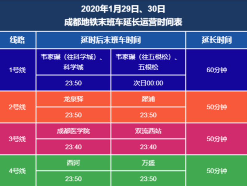 针对春节返程高峰(1月29、30日)乘客的出行需求,成都地铁各线路将延长运营服务时间50-60分钟,同时在部分站点提供行李捆扎、平板车等服务。详情点击>>>