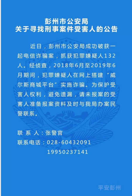 1月8日,彭州市公安局发布一则关于寻找刑事案件受害人的公告。该局近日破获一起电信诈骗案,抓获犯罪嫌疑人132人。2018年6月至2019年6月期间,犯罪嫌疑人在网上搭建“威尔斯商城平台”实施诈骗。为保护受害人权利,避免遗漏,请未报案的受害人准备报案资料,及时与办案民警联系。