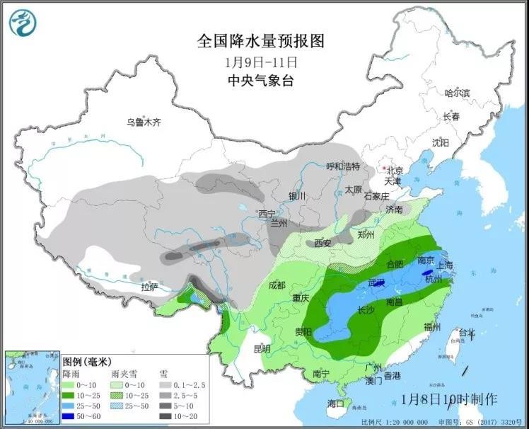 中央气象台预计,9日至11日,陕西南部、湖北西北部、河南、山东一带及以北地区有小到中雪或雨夹雪,青海南部、陕西南部、湖北西北部、河南南部等地局地大雪;江汉、江淮、江南、华南北部等地有中雨、局地大雨。