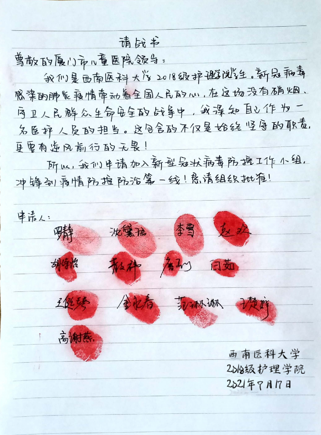 西南医科大学护理学院2018级厦门儿童医院实习生罗静告诉记者,“在我们13人来到厦门的第二个月,疫情越来越严重,科室里的老师也派出去了很多,我们大家都觉得作为医学生,应该做点什么,有了这个想法大家第一时间就联系了护理部的老师,9月17日,我们写下请战书,请求奔赴前线,参与抗疫,随后签下了自己的名字,盖下指纹,整个过程用时一小时。”