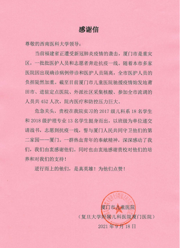 近日,西南医科大学护理学院收到了一份特殊的礼物——复旦大学附属儿科医院厦门医院的感谢信。为啥会收到这封感谢信,一切还得从一份请战书说起。