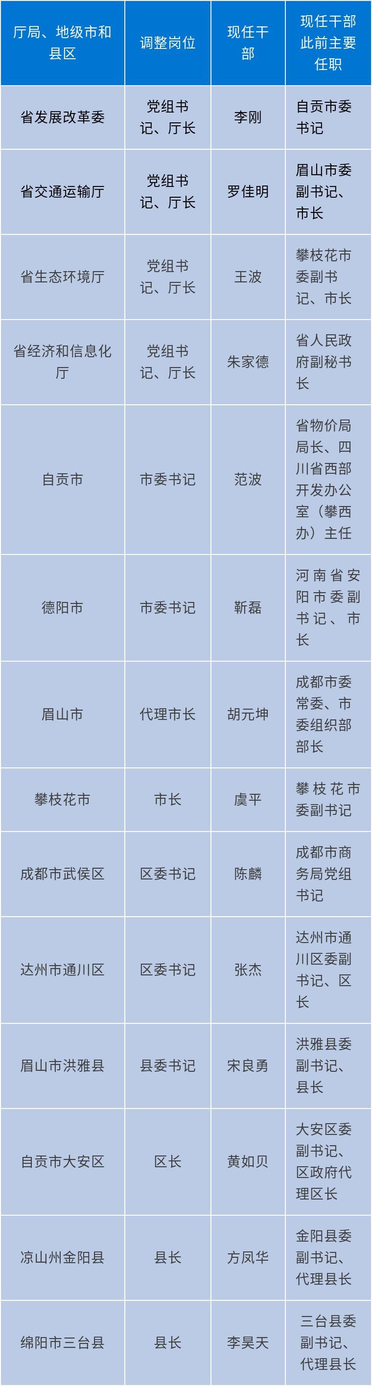 岁末年初,四川已有14个厅级部门、地级市、县区党政“一把手”调整。(具体情况见下表)