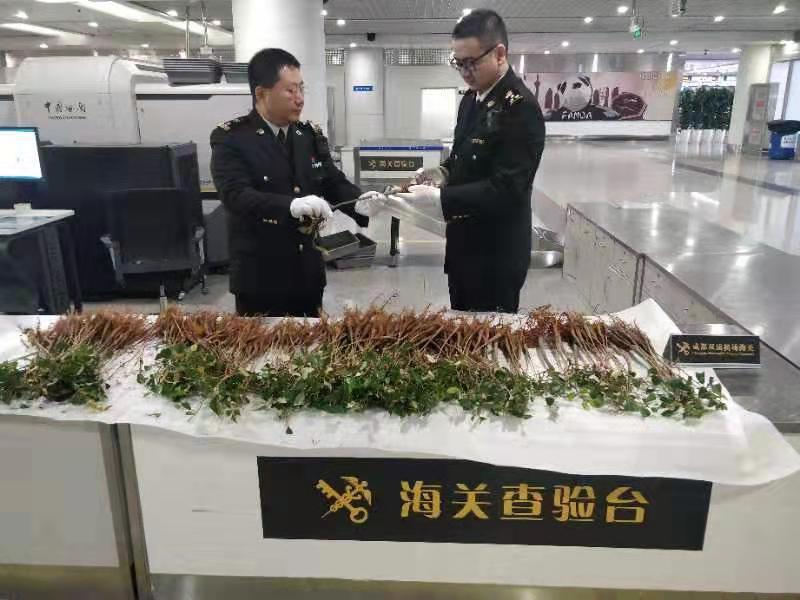 成都海关旅检关员在对入境旅客行李进行先期机检时,发现一名自曼谷入境旅客的托运行李存在异常,经现场关员开箱检查,发现箱子里装满了植物根茎,根系完整并且带有泥土。