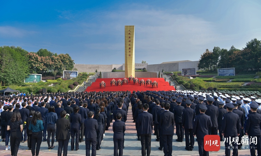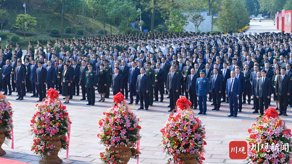 成都市烈士陵园,松柏苍翠、庄严肃穆。追思大道一侧陈列的一幅幅图片,展示了不同历史时期川籍革命英烈的感人事迹,讲述了他们前仆后继、矢志不渝为民族独立、人民解放和国家富强、人民幸福作出的牺牲和贡献。陵园内,革命烈士纪念碑巍然耸立,“人民英雄永垂不朽”八个大字熠熠生辉。1000余名各界代表,面向纪念碑整齐列队。