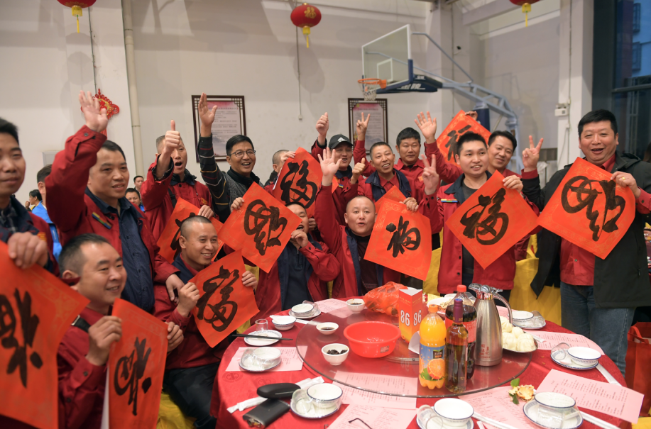 下午5点过,记者来到黄边文体康乐馆。只见诺大的黄边文体康乐馆大厅里张灯结彩喜气洋洋。十人一桌的大圆桌,摆了整整 100桌。大厅进门一侧,志愿者正在书写福字,供农民工免费领取。一名农民工直接挤过去领了五张,有人问他为什么领那么多。他大声回答道:“不都说五福临门么,过年了,领五张讨个好彩头。”周围的人都哈哈笑了起来。