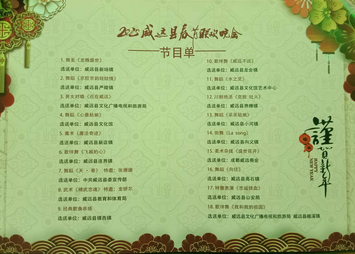 《我的中国心》《威远不远》等歌曲串烧,展现威远儿女血脉相连、众志成城的磅礴力量,也激荡着新时代威远儿女不忘初心、接力奋斗,迈向全省县域经济强县的澎湃交响;随后,舞蹈《水之灵》《采茶姑娘》,川剧绝活《变脸 吐火》,柔术杂技《盛世花开》精彩节目一个接一个,你方唱罢我登场,精彩不断,叫好声连连。