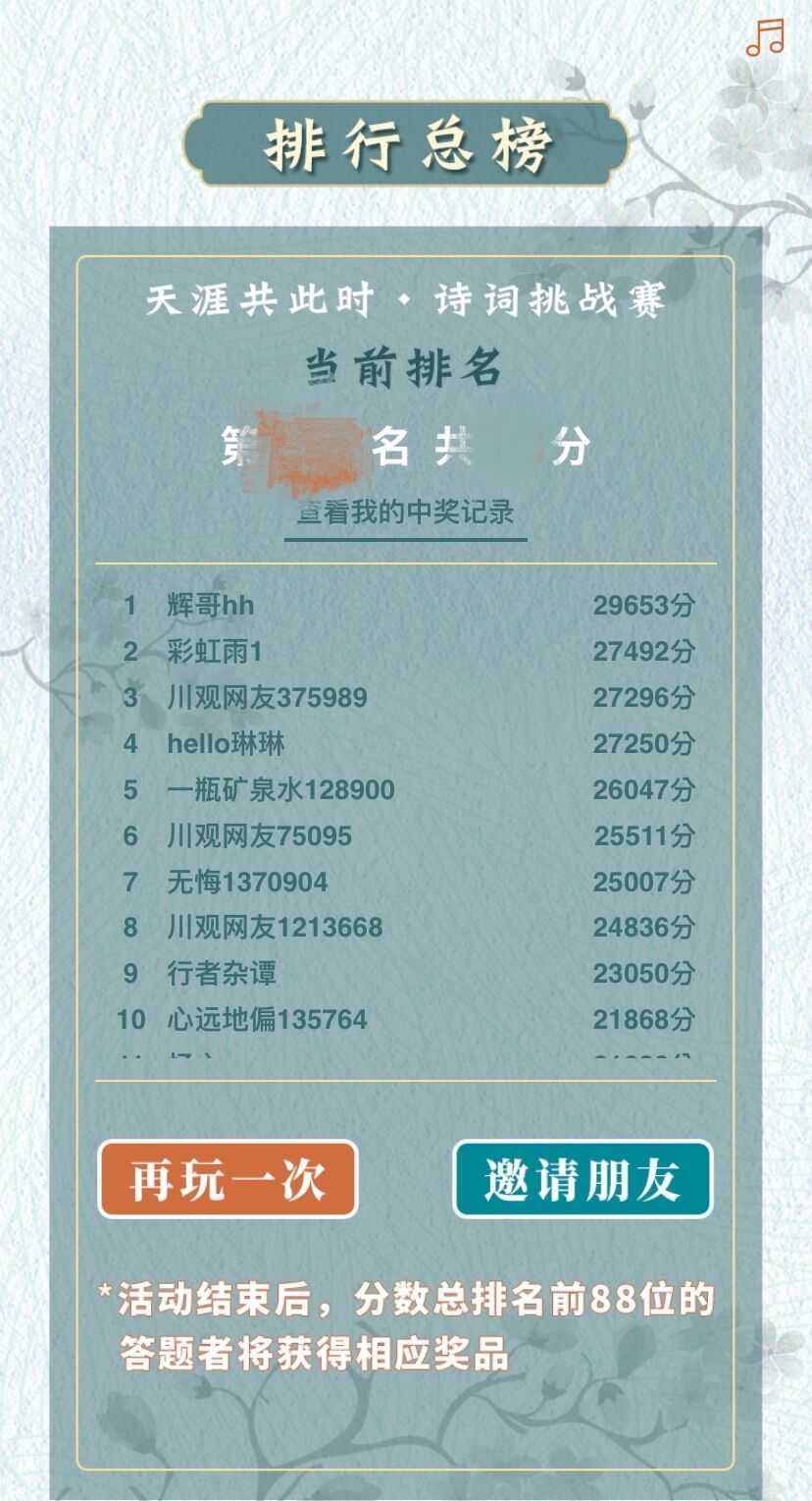 一次游戏,共答5题。答对加1分,答错不扣分。每天每人不限答题次数,每次答题分数计入个人总成绩,答题时间计入总用时。每天的答题成绩,将计入总分榜,系统按照用户总成绩分数高低排出排行榜。分数相同时,答题总用时短的排名在前。